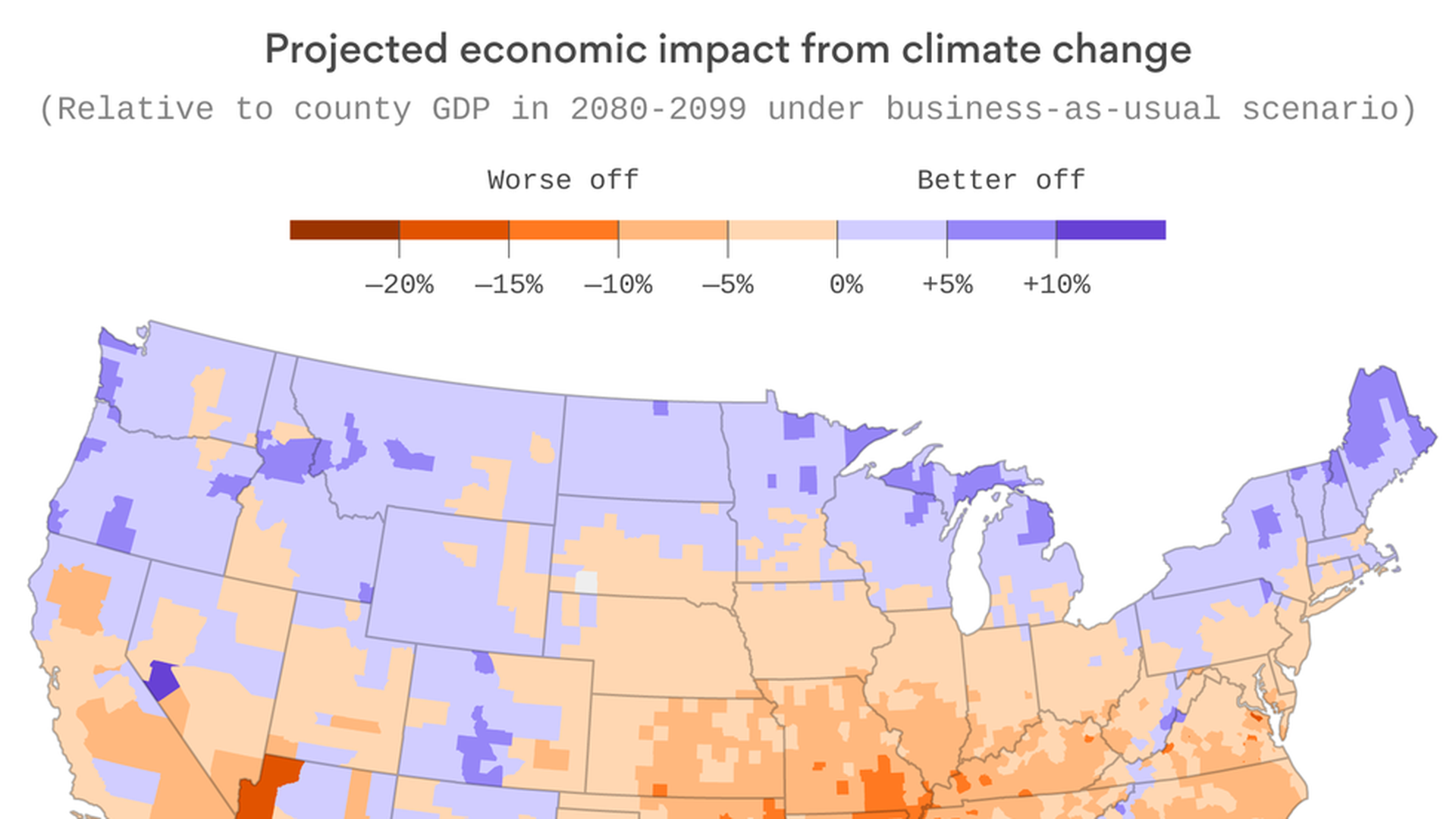 Local differences: If steps are not taken to lessen the rate of warming from climate change, counties in the South and lower Midwest — which on average are already poorer and warmer — may lose as much as 20% of their income and may experience higher mortality rates. However, areas of the Pacific Northwest, the Great Lakes region and New England — which tend to be wealthier and cooler — could benefit economically from the change and see lower mortality rates.