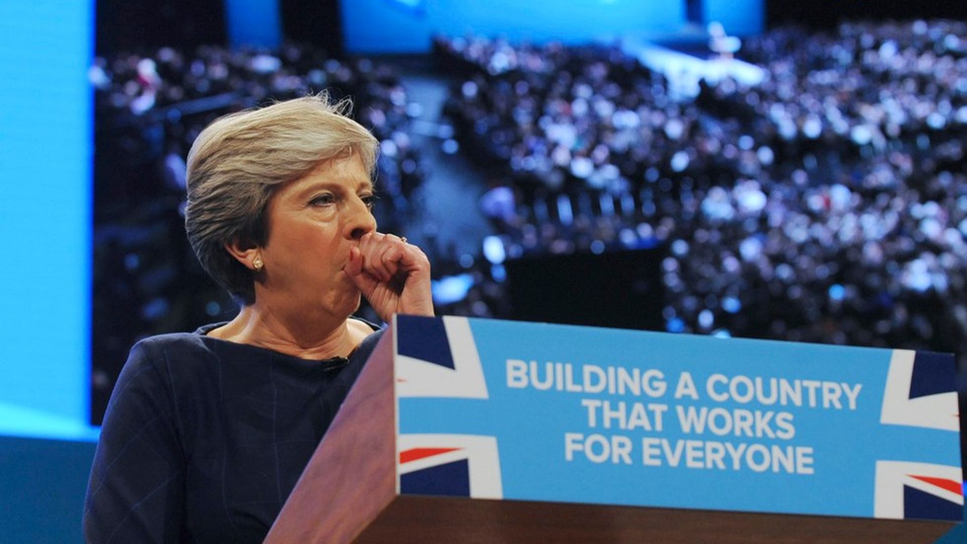 Theresa May coughs during her keynote speech to the Conservative Party conference. Photo: Rui Vieira / AP