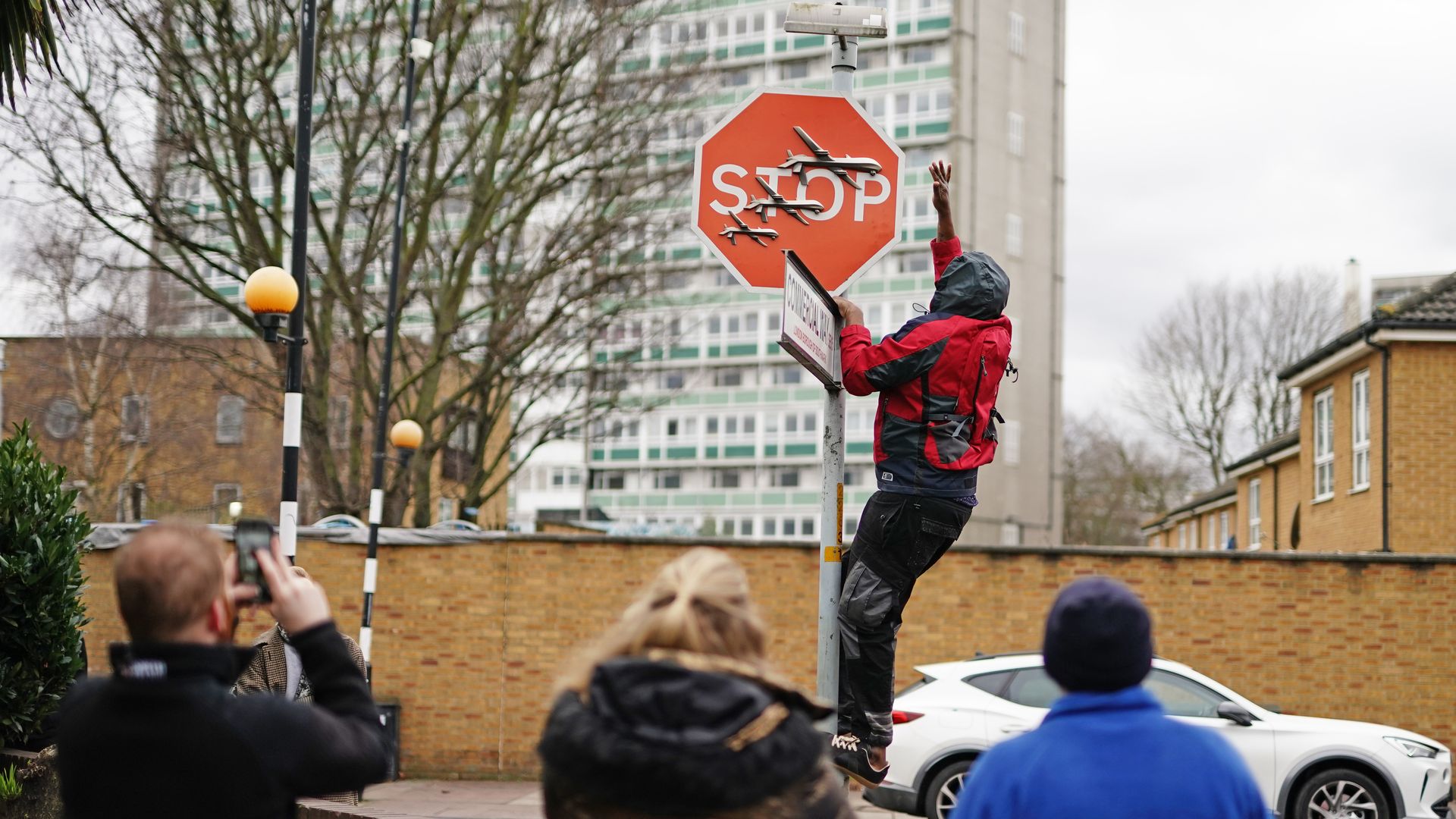 The big picture: London's Metropolitan Police said they're "aware of footage being shared" to social media showing the removal of the stop sign that features three drones, which has been widely interpreted as calling for a cease-fire in Gaza as it's reminiscent of artwork in Banksy's Walled Off hotel in Bethlehem that was established in 2017.