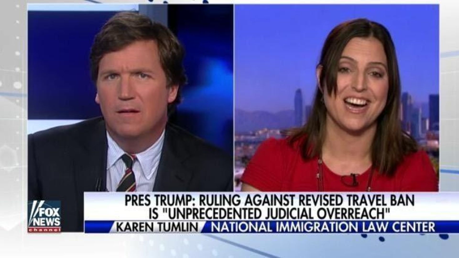 Some cable shows rely on the drama of putting people in the same place, but Carlson's thrives on remote interviews, which allow his producers to "box" his face, keeping it onscreen so that viewers can watch him react. When Carlson is talking to someone he agrees with, he pulls back, adopting the role of an earnest student seeking edification from a wise professor. But the segments most people remember are the contentious ones.