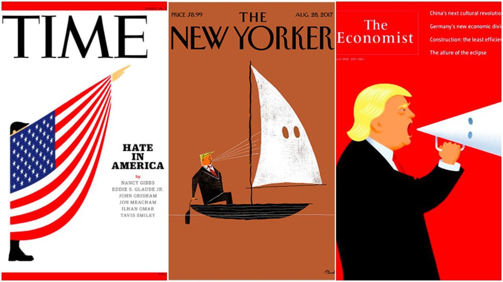 Many magazines are reacting with covers alluding to Trump's role in the racial tension currently reverberating through America after the white nationalist rally in Charlottesville, Virginia.