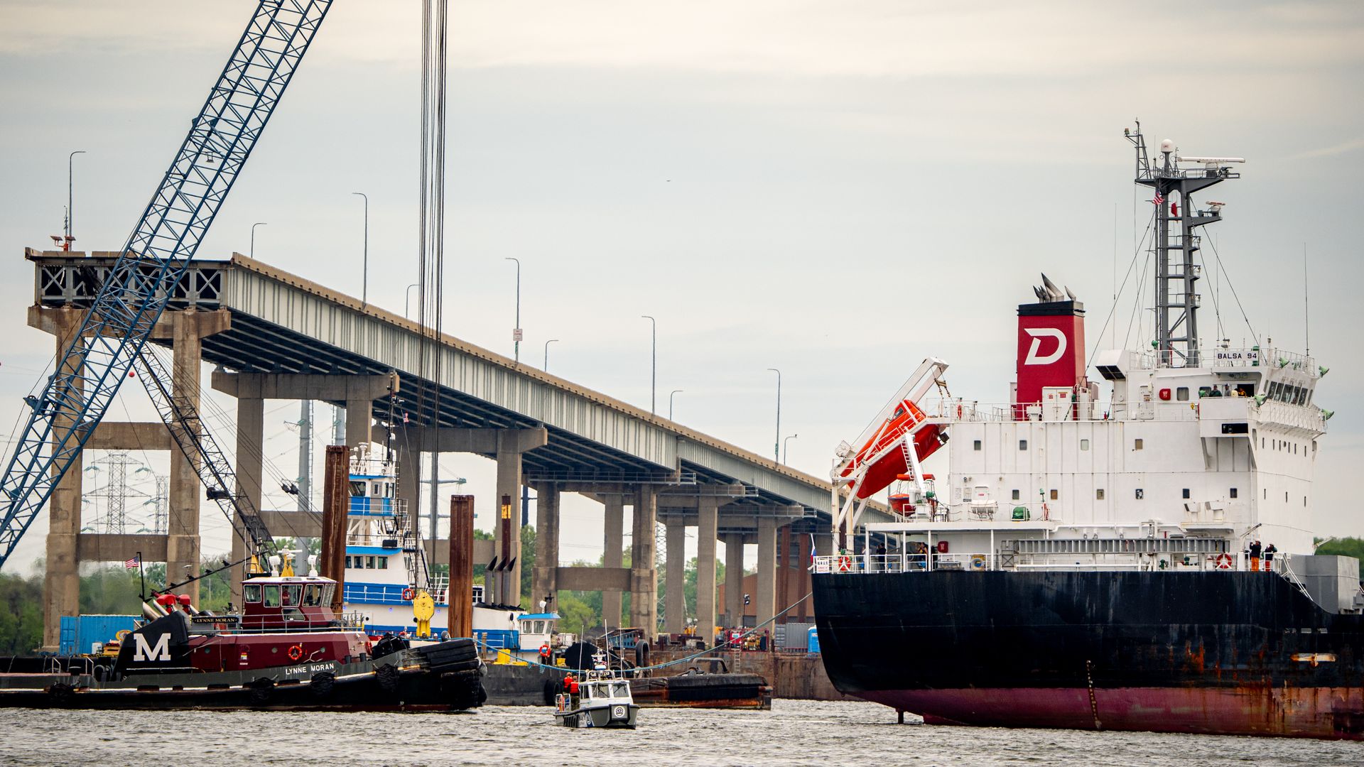 Why it matters: A cargo ship sailing past the wreckage of the bridge and the stranded Dali, which struck it, is a sign of the ongoing recovery efforts since the catastrophic bridge collapse killed six construction workers.
