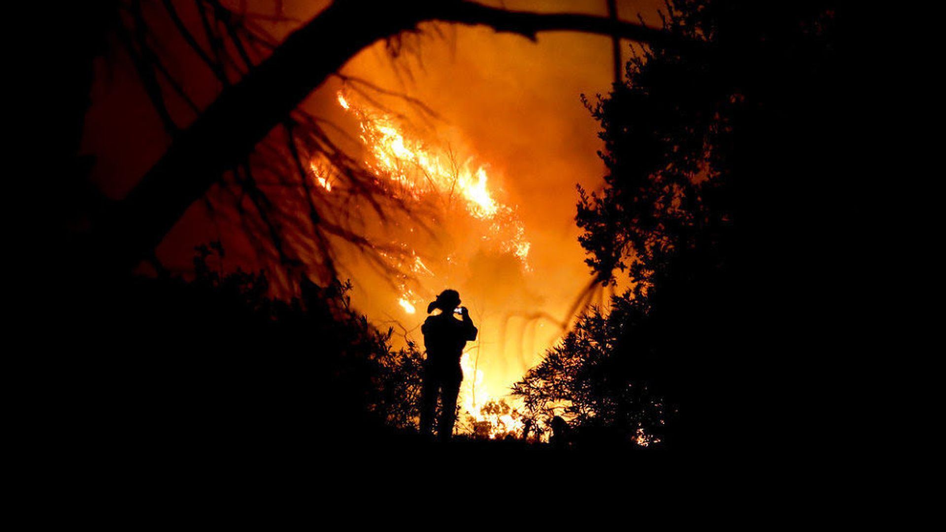 A firefighter takes a cellphone picture Saturday during a wildfire in Montecito, Calif. The Thomas Fire is now the third-largest in California history. L.A. Times: "Although an epic firefight Saturday was largely a success, preventing the mammoth Thomas fire from sweeping into whole neighborhoods in Montecito and Santa Barbara, some expensive homes were lost in this affluent coastal community known for its celebrity residents."