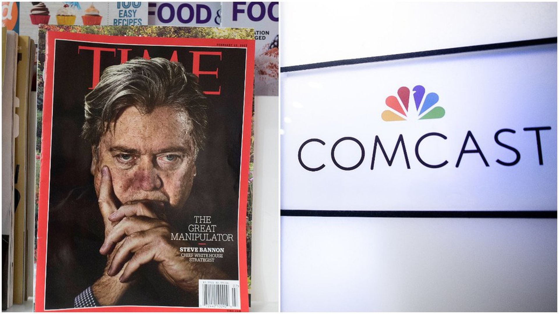 Steve Bannon on the cover of TIME, and Comcast's logo. Photos: Mark Lennihan and Jeff Fusco / AP