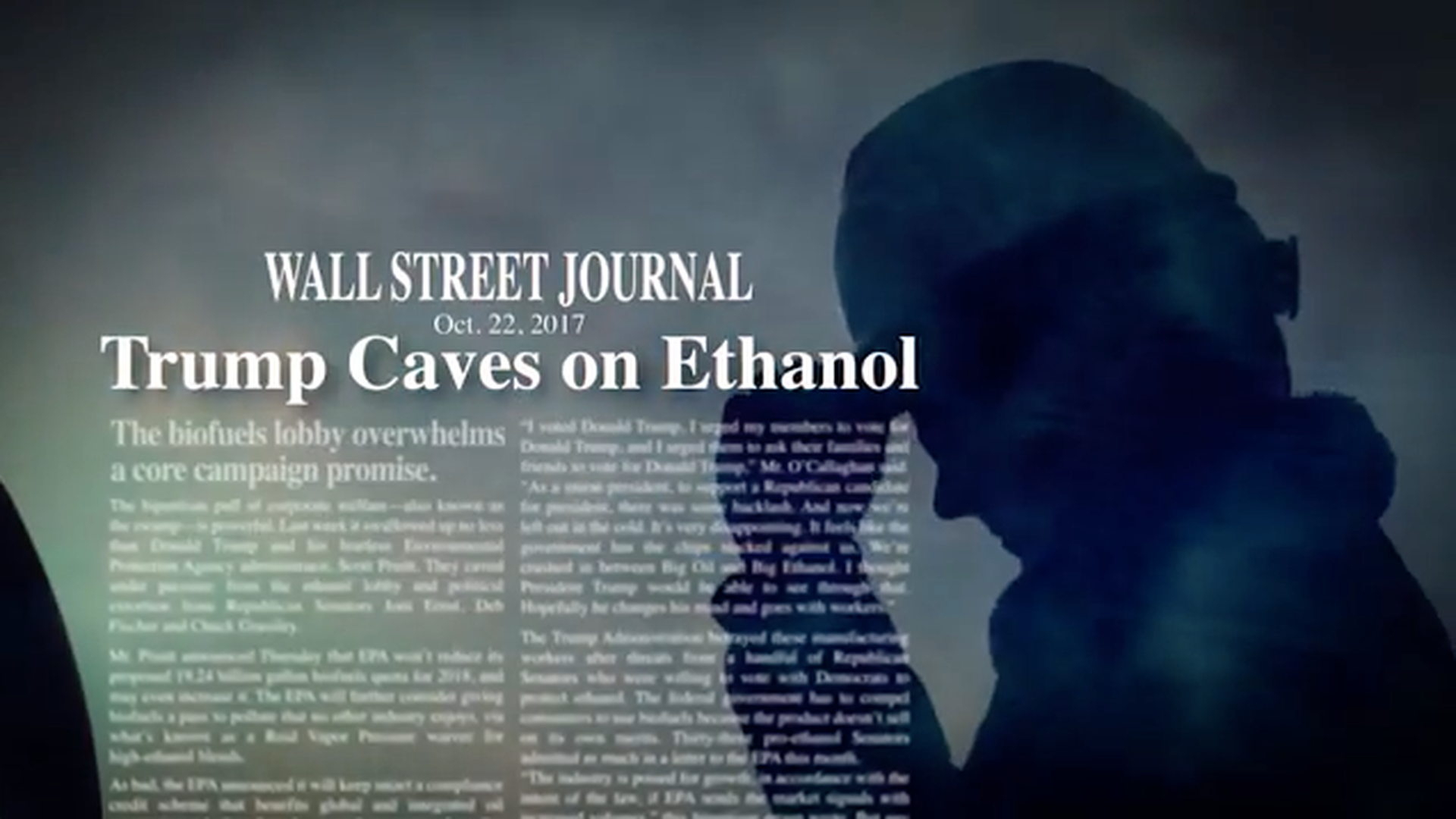 In their words: "Donald Trump campaigned on a promise to drain the swamp, protect our manufacturing jobs, and restore American energy dominance. That's why we elected him. But President Trump is caving to ethanol lobbyists, raising costs on American refiners to appease foreign biodiesel special interests, and jeopardizing U.S. energy independence," the ad states.