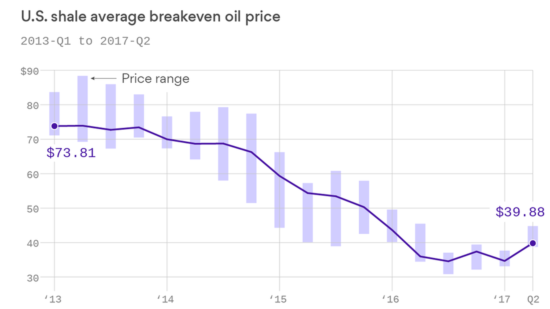 Shale's resilience: I found this chart in the big World Bank commodity markets outlook released late last week (and my colleague Andrew Witherspoon on the Axios Visuals team made the version above). It basically shows how the average per-barrel cost for U.S. shale projects to be economic has come down a lot.