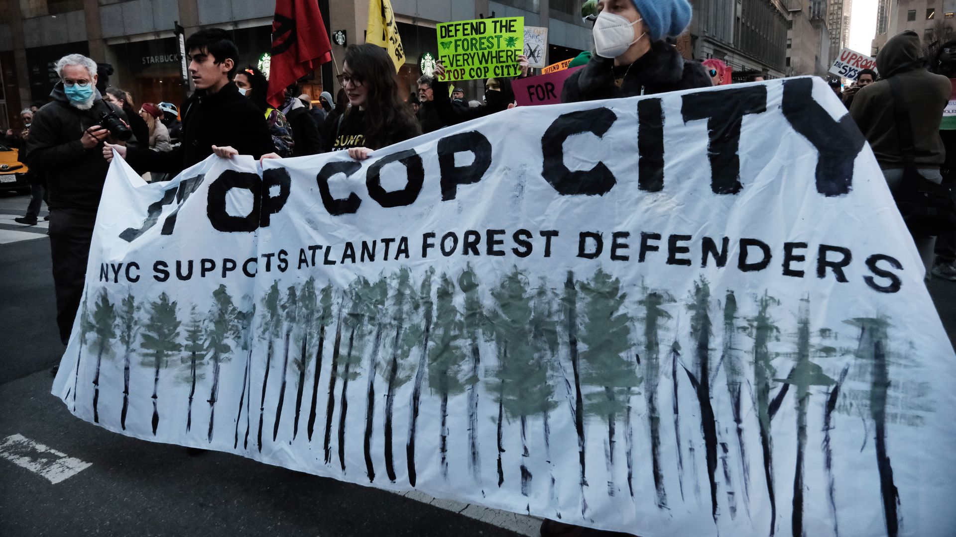 Activists in New York protested Atlanta's so-called "Cop City" earlier this month. Despite what's become a national protest movement, officials are moving forward, but promise to continue to incorporate more community input. Photo: Spencer Platt/Getty Images
