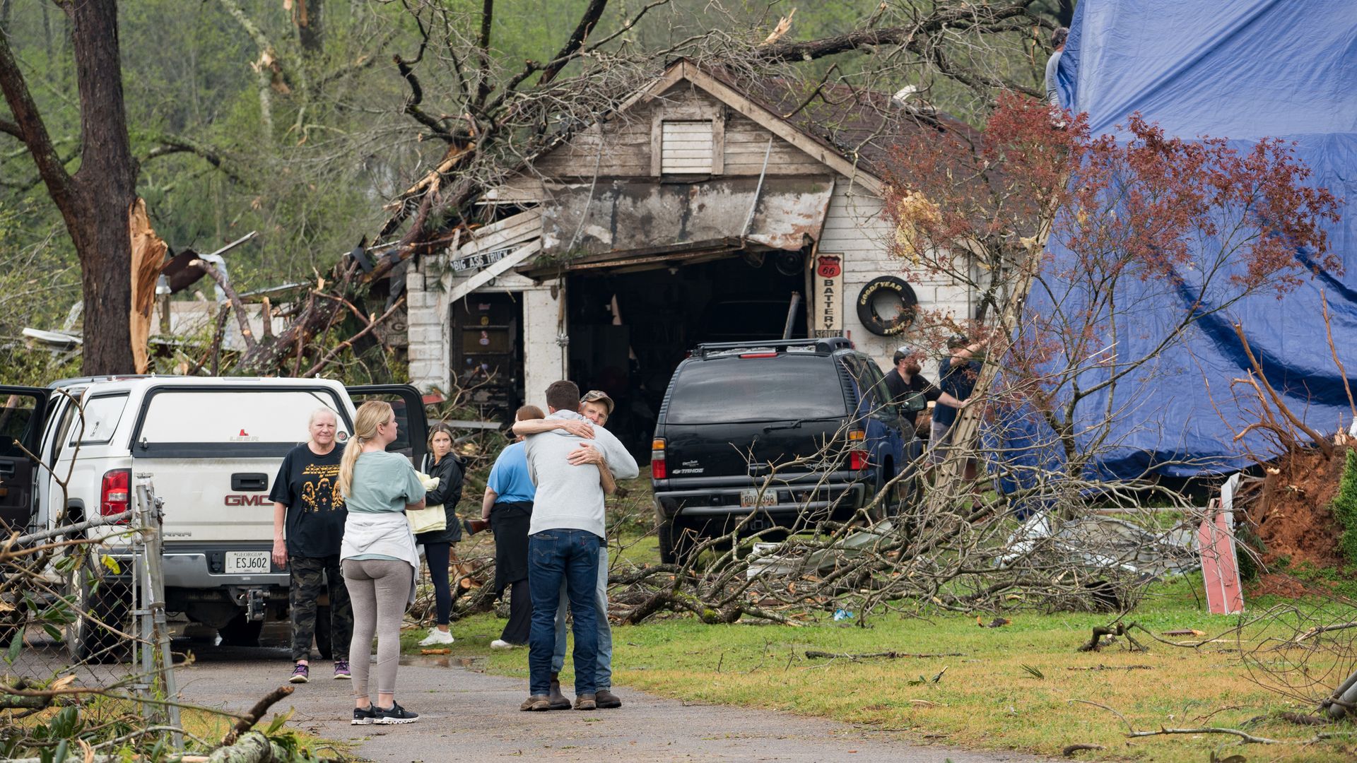 A family embraces outside of their damaged home after a tornado touched down on March 26 in West Point, Georgia. Photo: Megan Varner/Getty Images