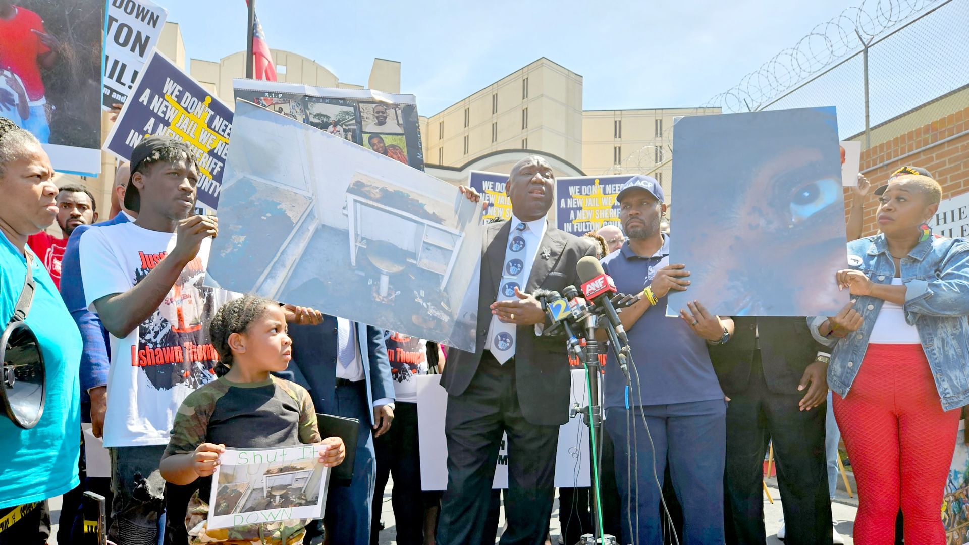 Attorney Ben Crump (center) holds up a photo showing Lashawn Thompson's cell at the time of his death at the Fulton County Jail. Photo: Kristal Dixon/Axios