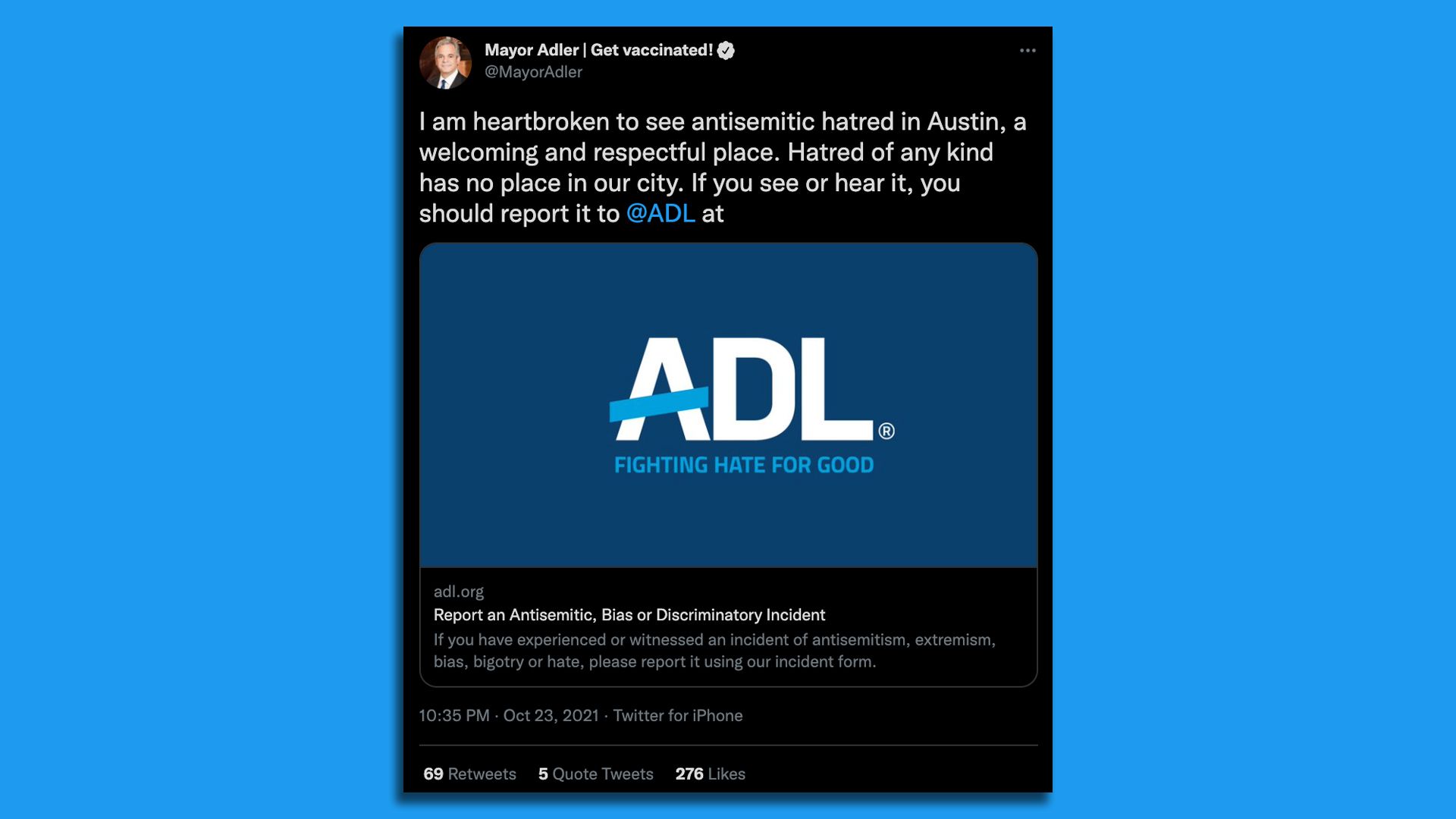 "I am heartbroken to see antisemitic hatred in Austin, a welcoming and respectful place," Mayor Steve Adler wrote on Twitter. "Hatred of any kind has no place in our city."