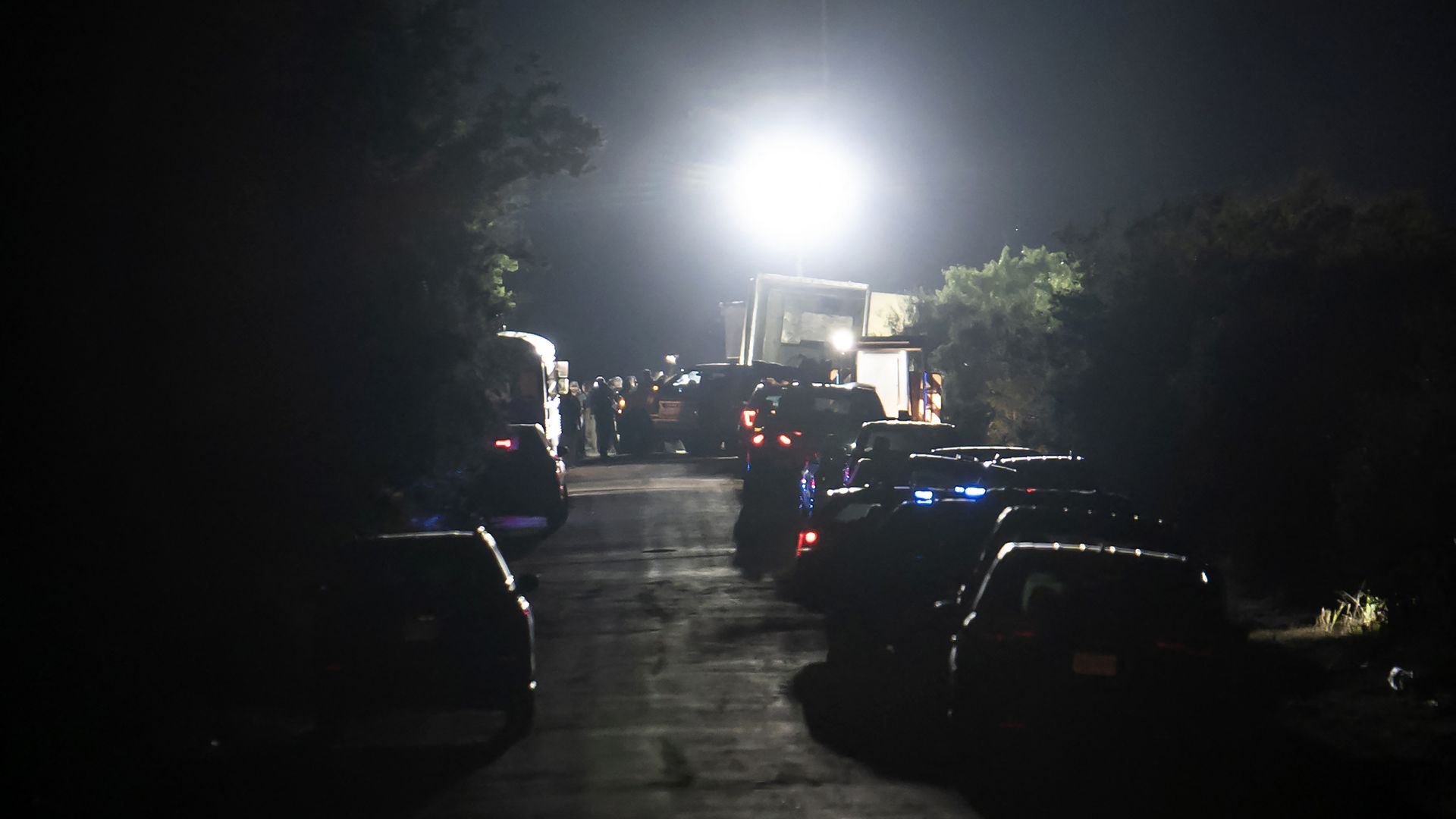 Emergency vehicles at the scene where a tractor-trailer was discovered with migrants inside. Photo: Sergio Flores via Getty Images