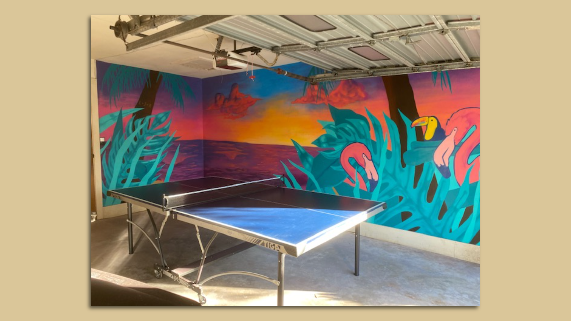 Axios Austin reader Laura Montero beats the heat with the help of her pingpong table, an industrial fan and a tropical mural from local artist Efren Rebugio Jr. Photo courtesy: Laura Montero