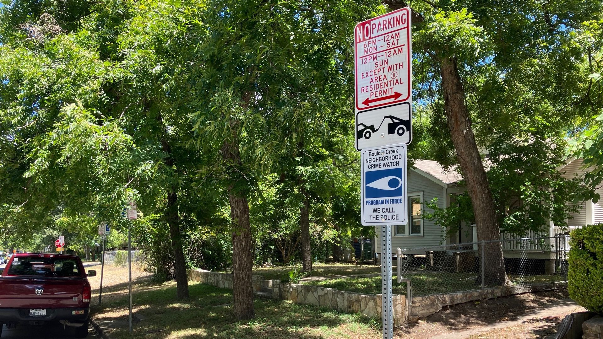 A residential parking permit sign stands sentinel on a street off South Congress. Photo: Asher Price/Axios