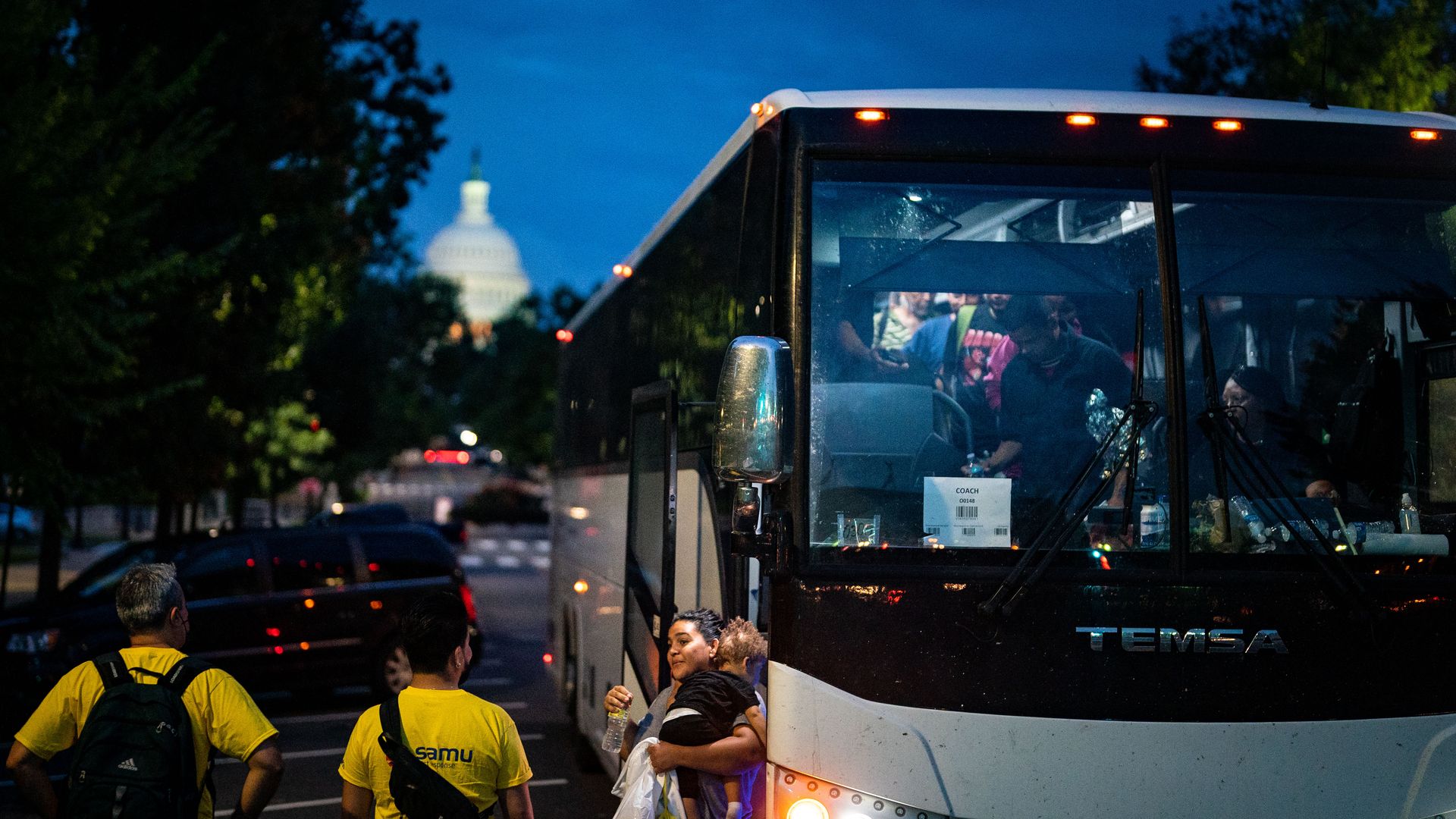 Migrants disembark a bus from Texas within view of the U.S. Capitol on Aug. 11. Photo: Kent Nishimura / Los Angeles Times via Getty Images