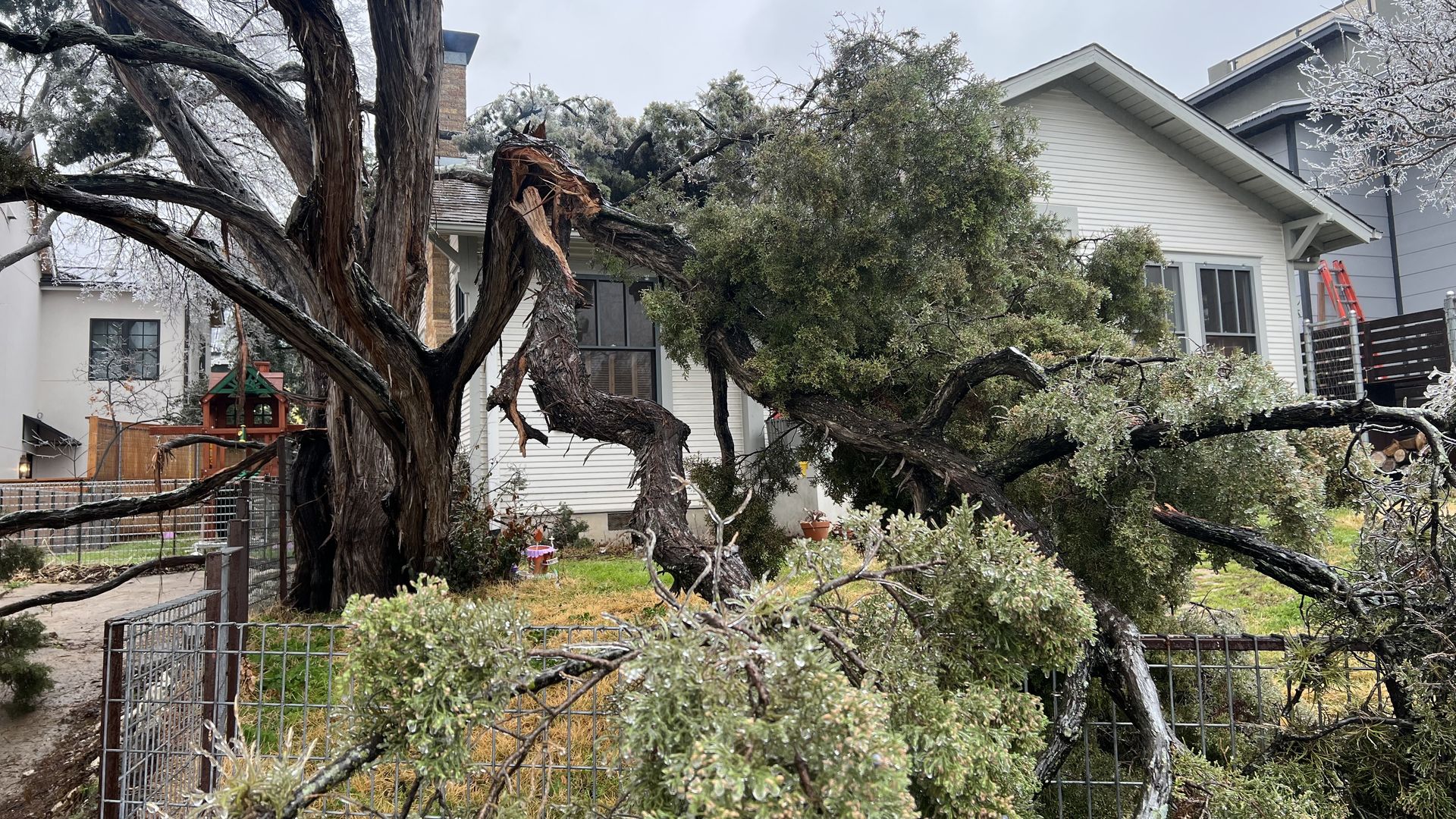 A downed cedar limb just dodges a South Austin home. Photo: Bob Gee/Axios