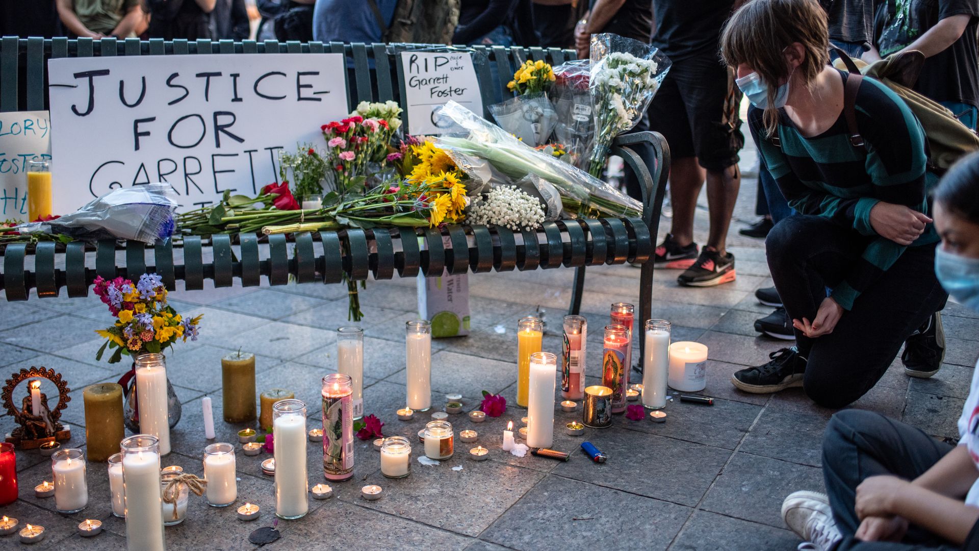An attendee pays respects at a vigil for Garrett Foster on July 26, 2020 in downtown Austin, Texas. Photo: Sergio Flores/Getty Images