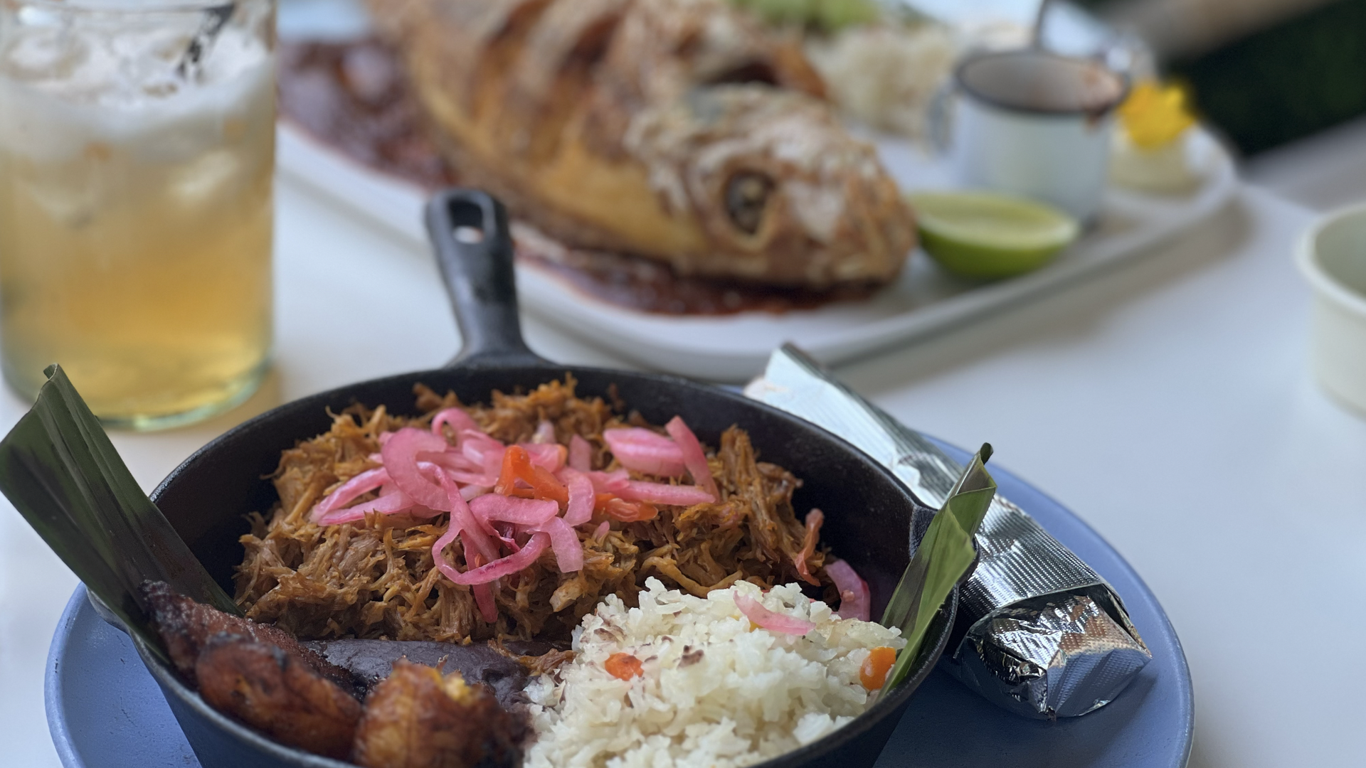 Veracruz Fonda's cochinita pibil, marinated pork served with red onion escabeche, refried black beans, rice and fried sweet plantains. Photo: Nicole Cobler/Axios