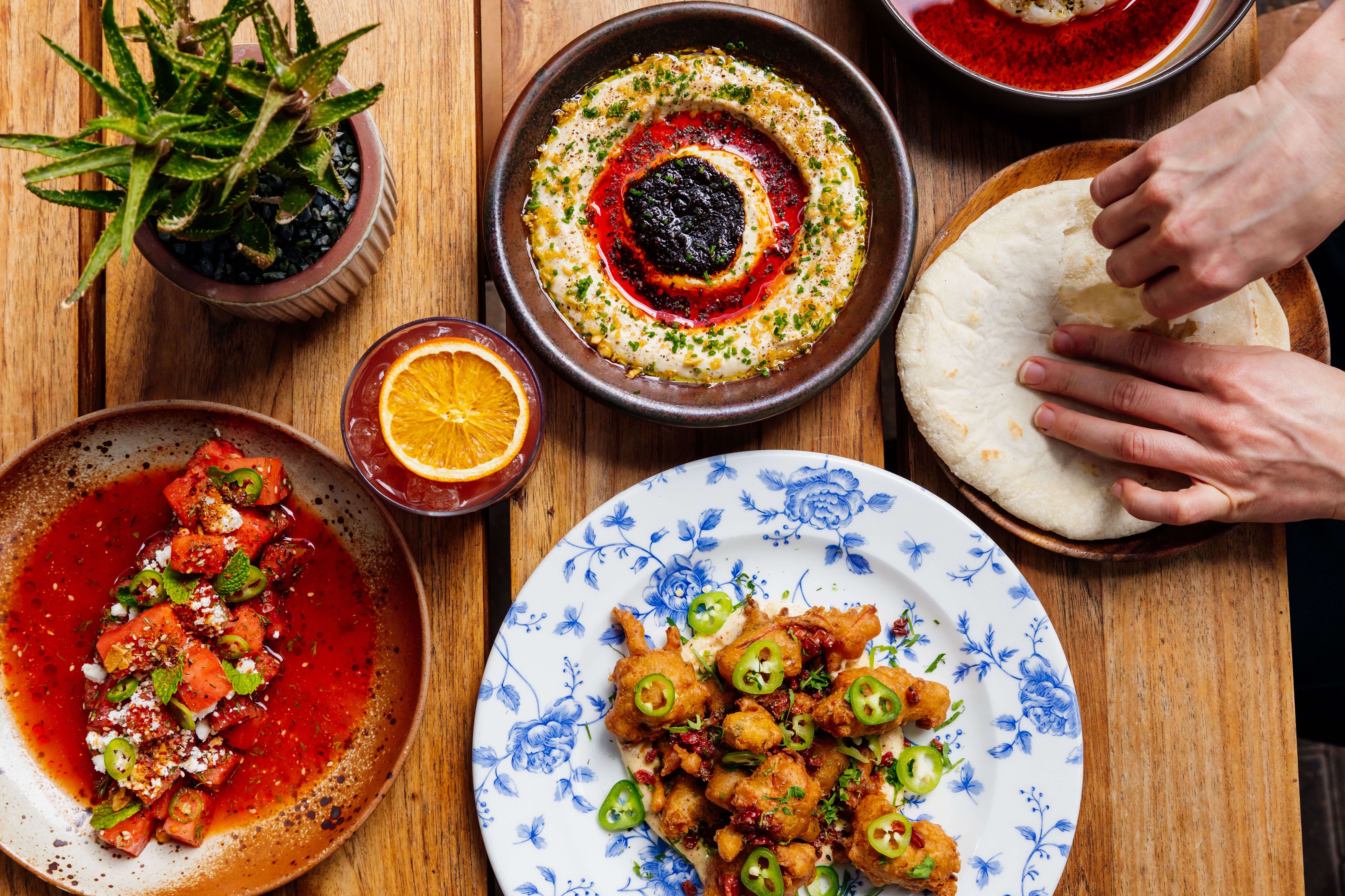 - The crispy shallot hummus was accented with zhoug and chermoula, two Arab world sauces that are having an international culinary moment. We scooped it all up with warm, pillowy flatbread that evoked the bakeries of Damascus.