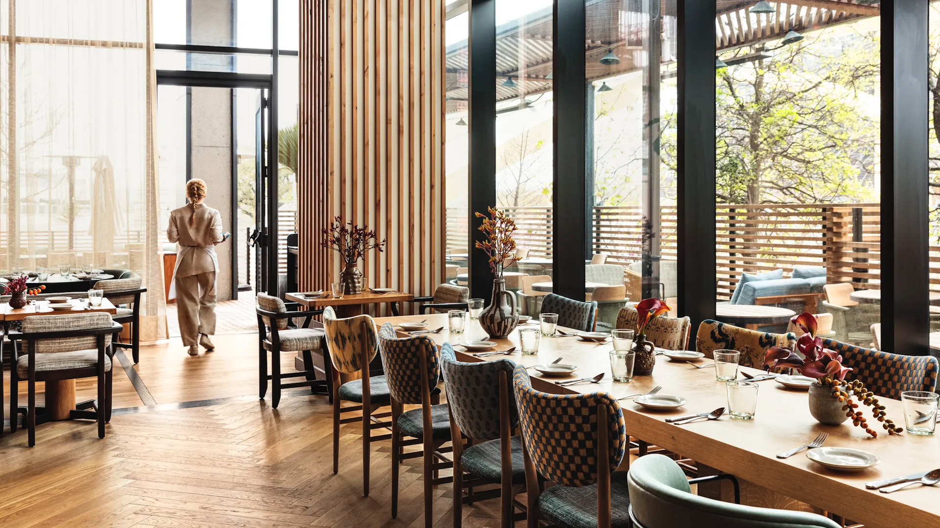 - With its hand-knotted rugs, encaustic tile wall installation, blond wood tables and soaring windows, the vibe is Middle East-meets-California.