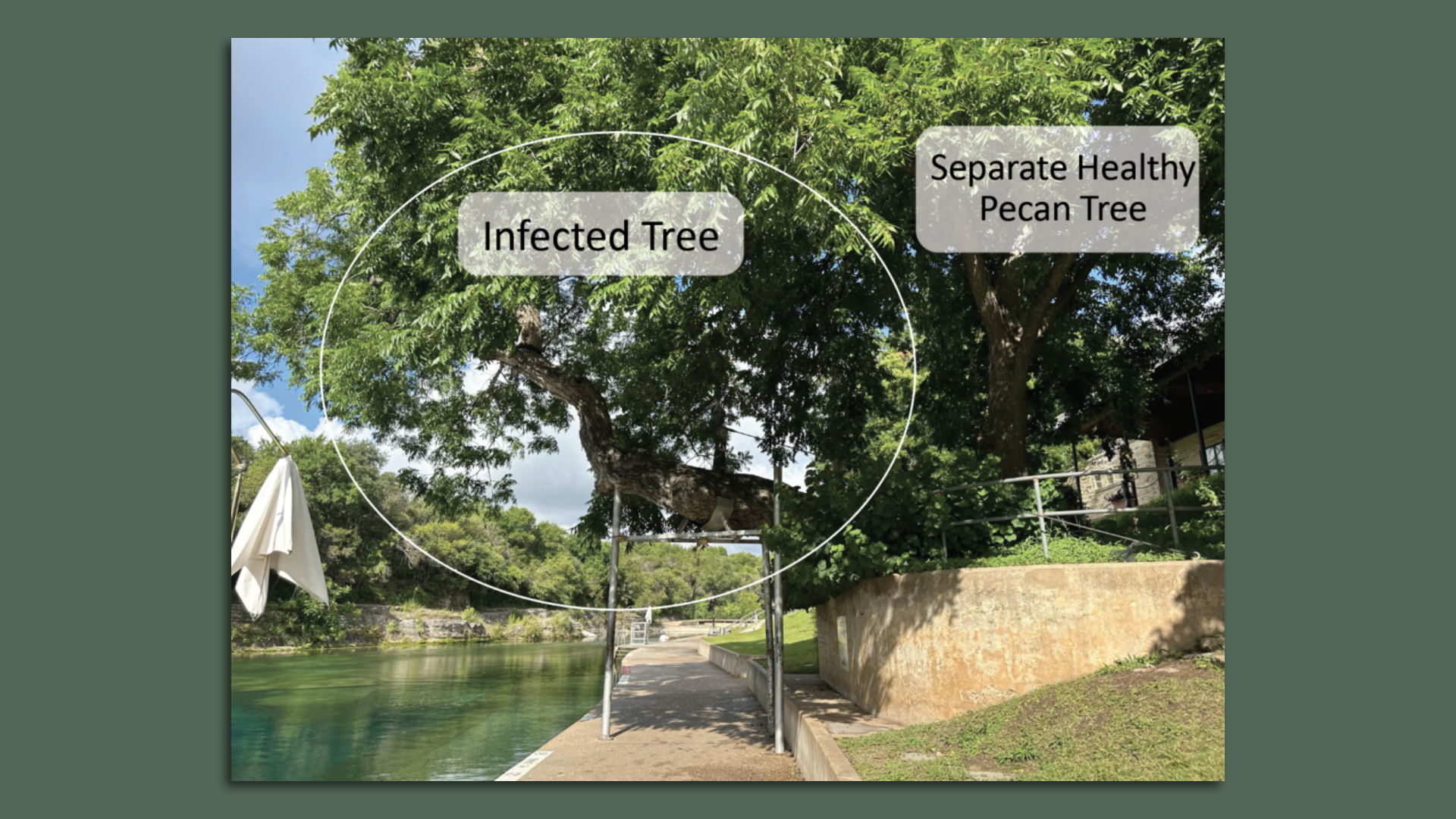 The backstory: In July, Austin Parks and Recreation Department staff performed an inspection of Barton Springs Pool and noticed a fungal fruiting body at the base of the tree. A diagnostic lab confirmed the diagnosis.