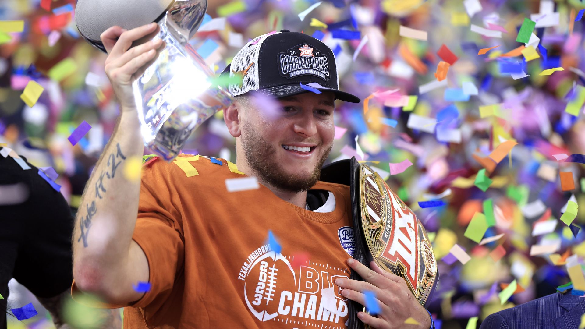 Longhorns quarterback Quinn Ewers celebrates after Texas defeated Oklahoma State in the Big 12 Championship on Saturday in Arlington. Photo: Ron Jenkins/Getty Images