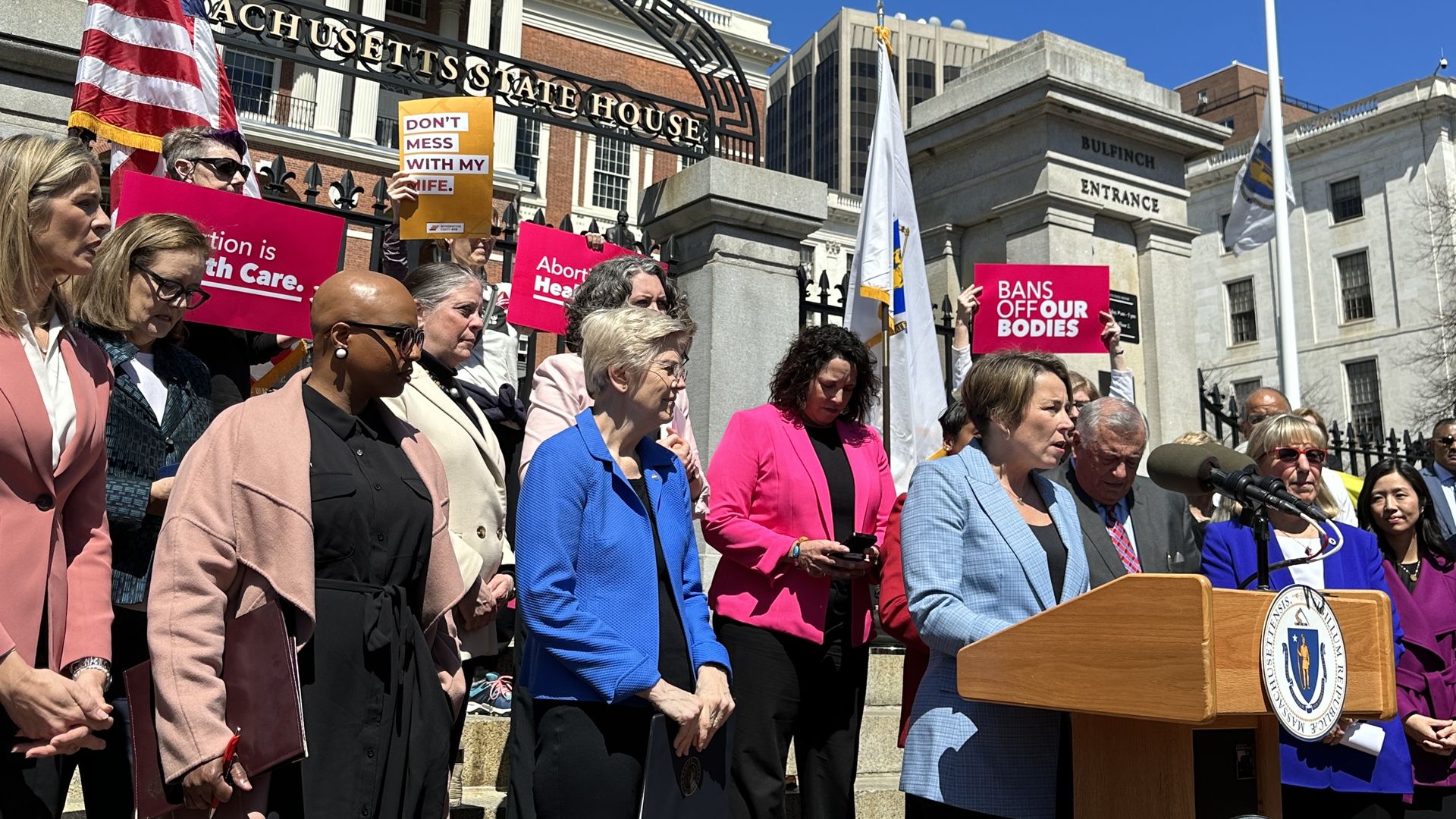 Gov. Maura Healey, right, announces she signed an executive order in response to recent court rulings about medication abortion access. Photo: Steph Solis/Axios