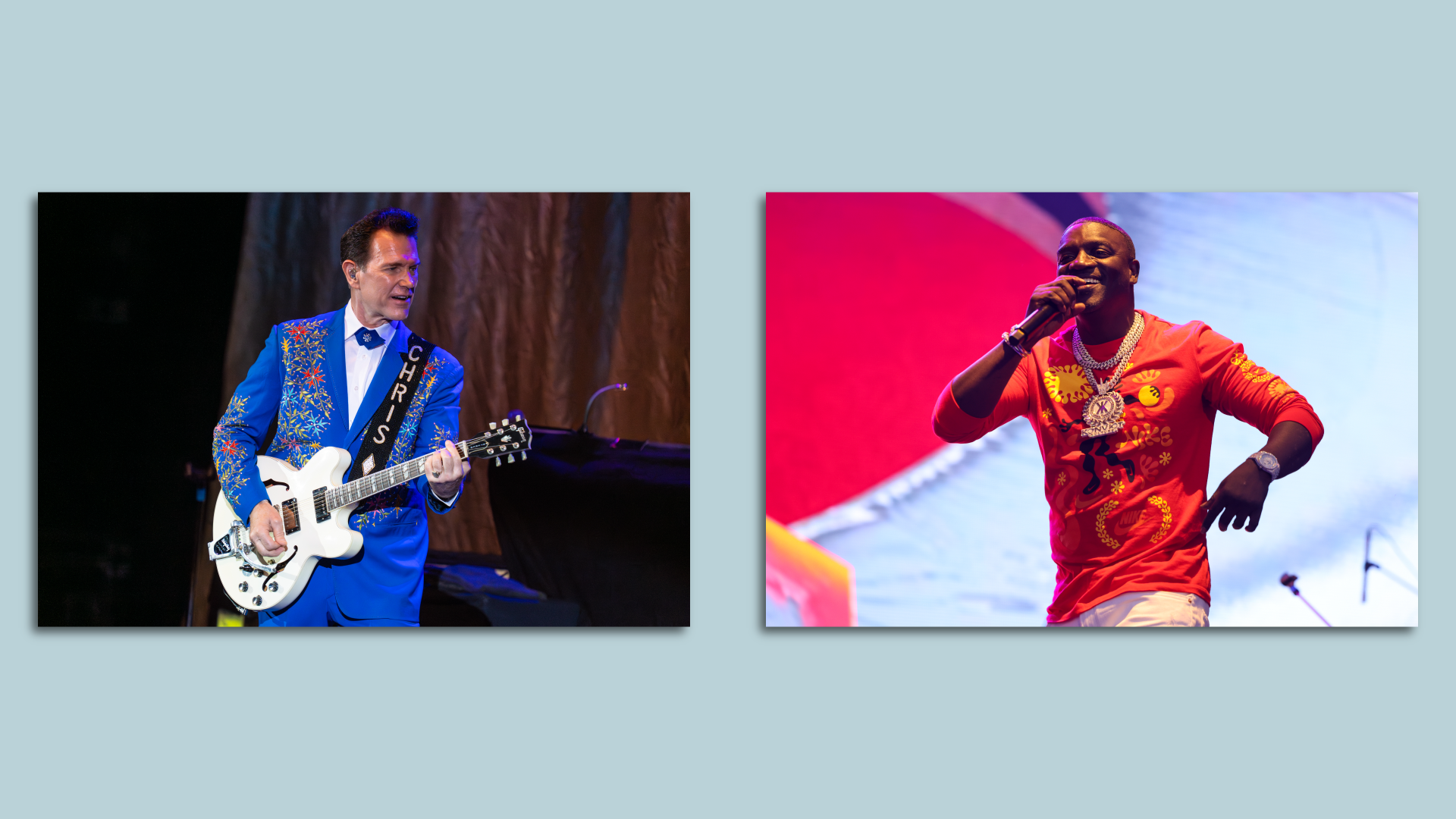 Chris Isaak and Akon take the stage in Boston this weekend. Isaak photo: Lorne Thomson/Getty Images. Akon photo: Dave Simpson/Getty Images.