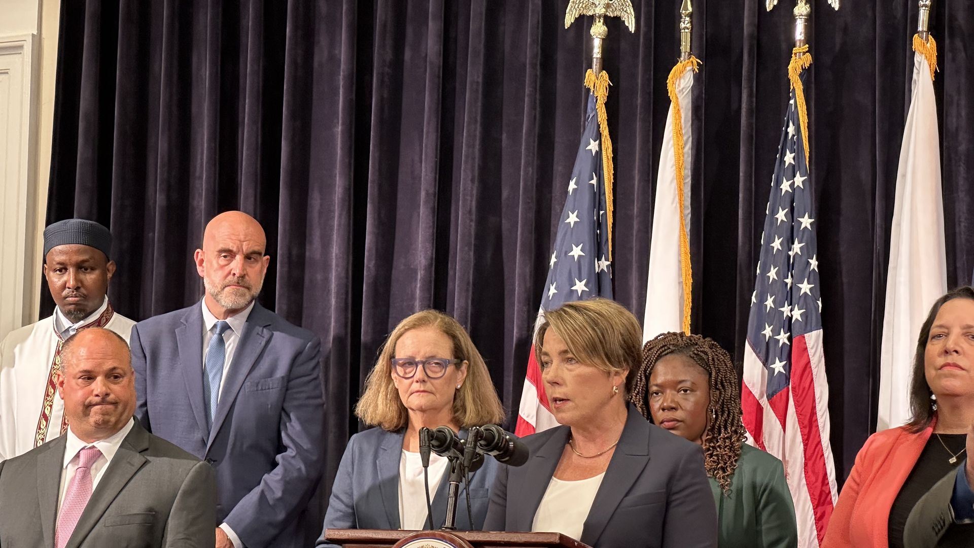 Gov. Maura Healey announced the emergency declaration at the State House. Photo: Steph Solis/Axios