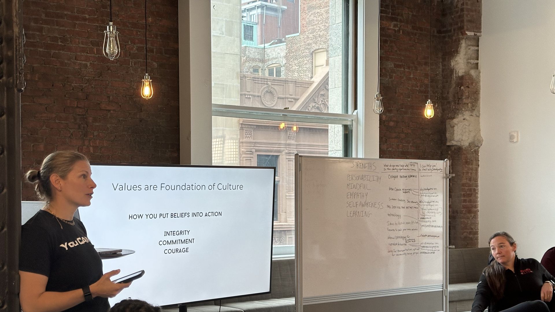 Holly Austin, founder of Ready Set Row, leads a panel at the Women's Coaching Conference. Photo: Steph Solis/Axios