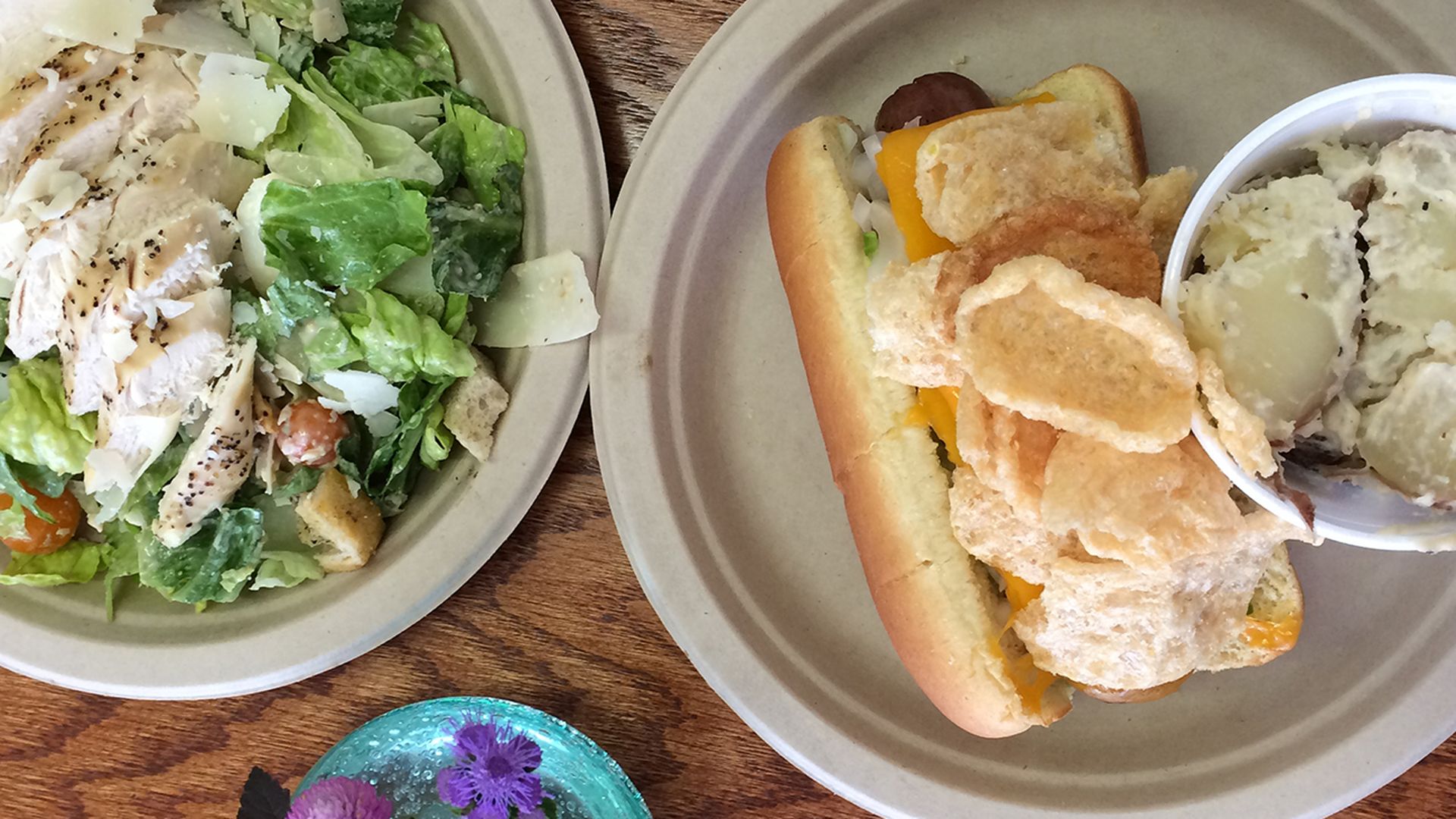 - Caesar Salad ($7.50) with romaine, croutons, cherry tomatoes, and “good cheese.” For $4, you can also add a perfectly grilled and sliced chicken breast. The tomatoes could have been their own main event. Their bright, bursting flavors made them that sparkling part of salad that you actively dig to find.