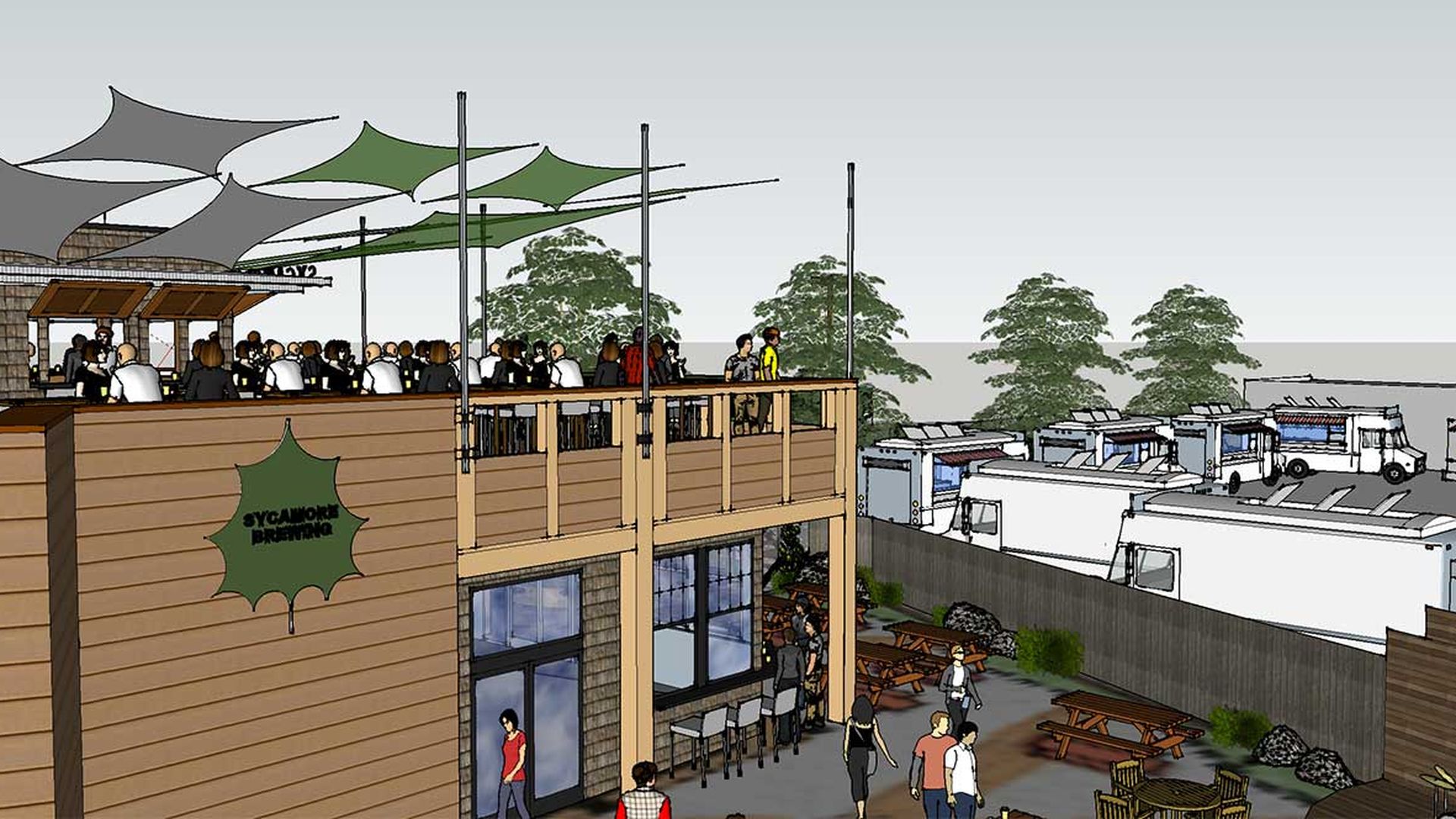 The new taproom itself is going to have a tree motif, with two new 20-foot trees put in and green sail shades that will make the place look like a tree from the air.