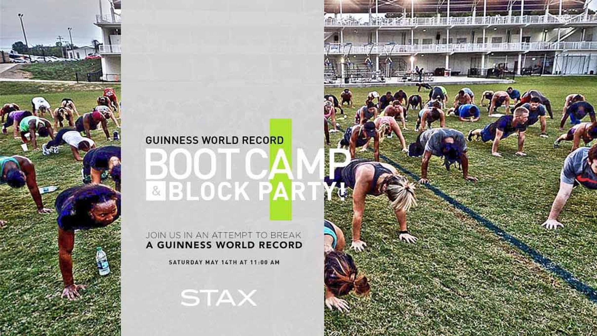 STAX Bootcamp Guinness Book of World record attempt: Join Randy Moss and Emily Breeze at 11 a.m. as they attempt to break the Guinness World Record for the largest bootcamp/circuit training in history. Stick around after for a block party with food trucks, local beer and vendors. Free. Saturday, 5/14