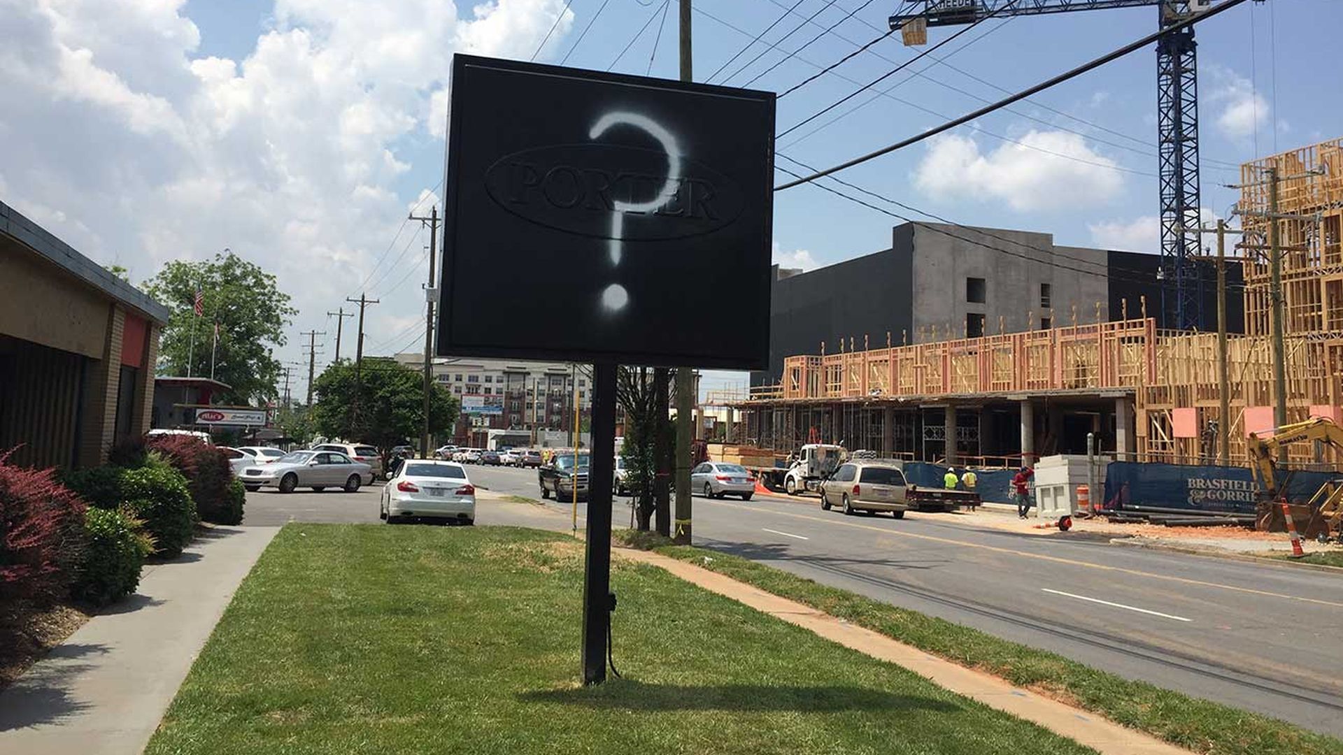 Right by Mac’s Speed Shop on South Boulevard, the old Porter Paints sign has been covered over with a question mark on a black background.