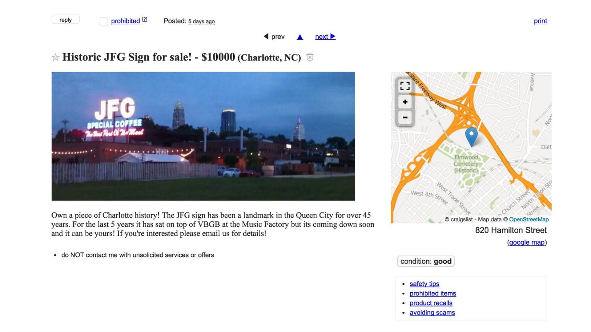 The JFG Coffee sign was listed for sale on Craiglist on Thursday, May 26.