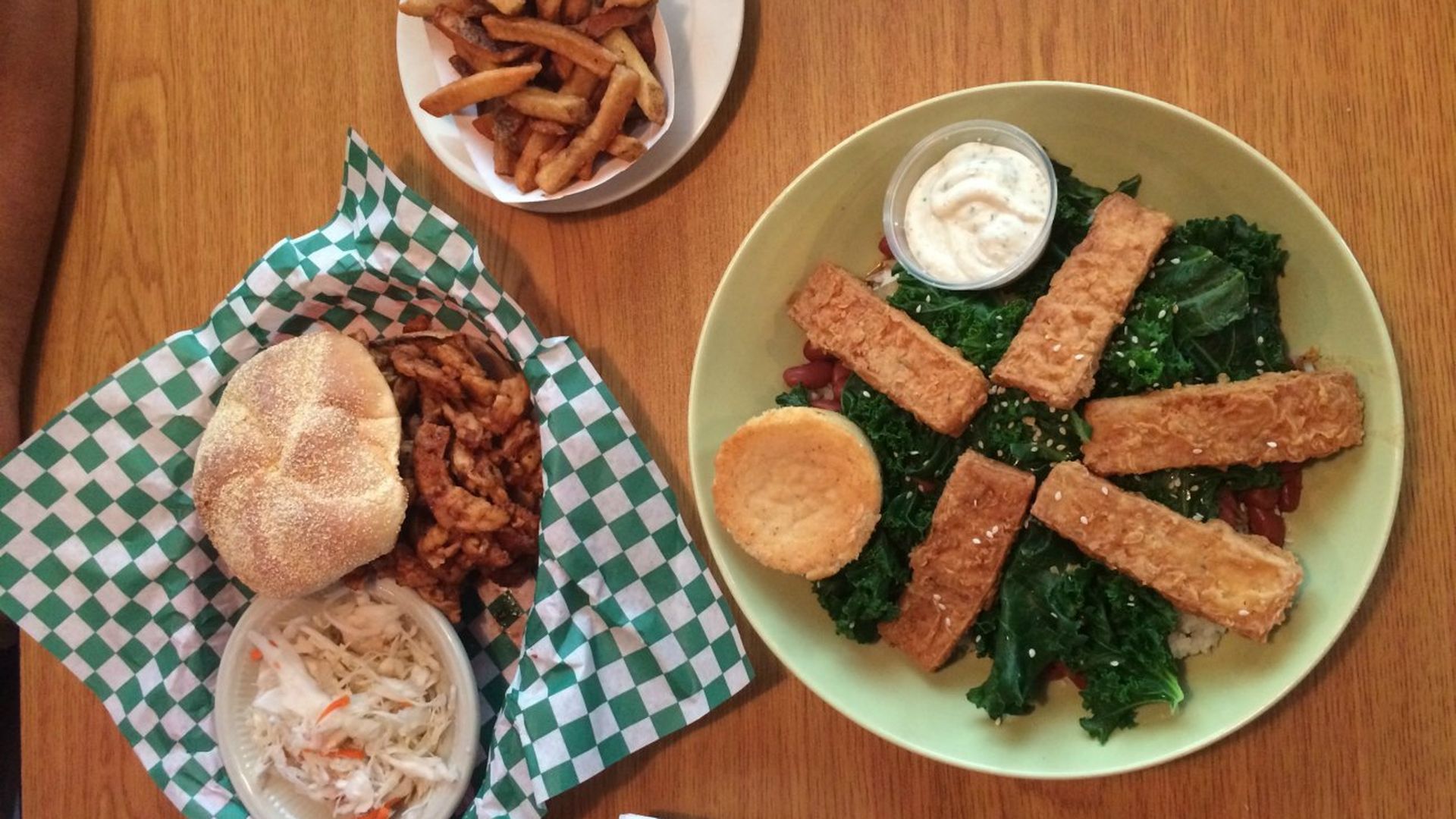 The BBQ sandwich is made with soy curls and your choice of spicy or sweet mustard barbecue sauce. The Bean Bowl is a hearty pile of red beans, rice, steamed kale and fried tofu fingers.