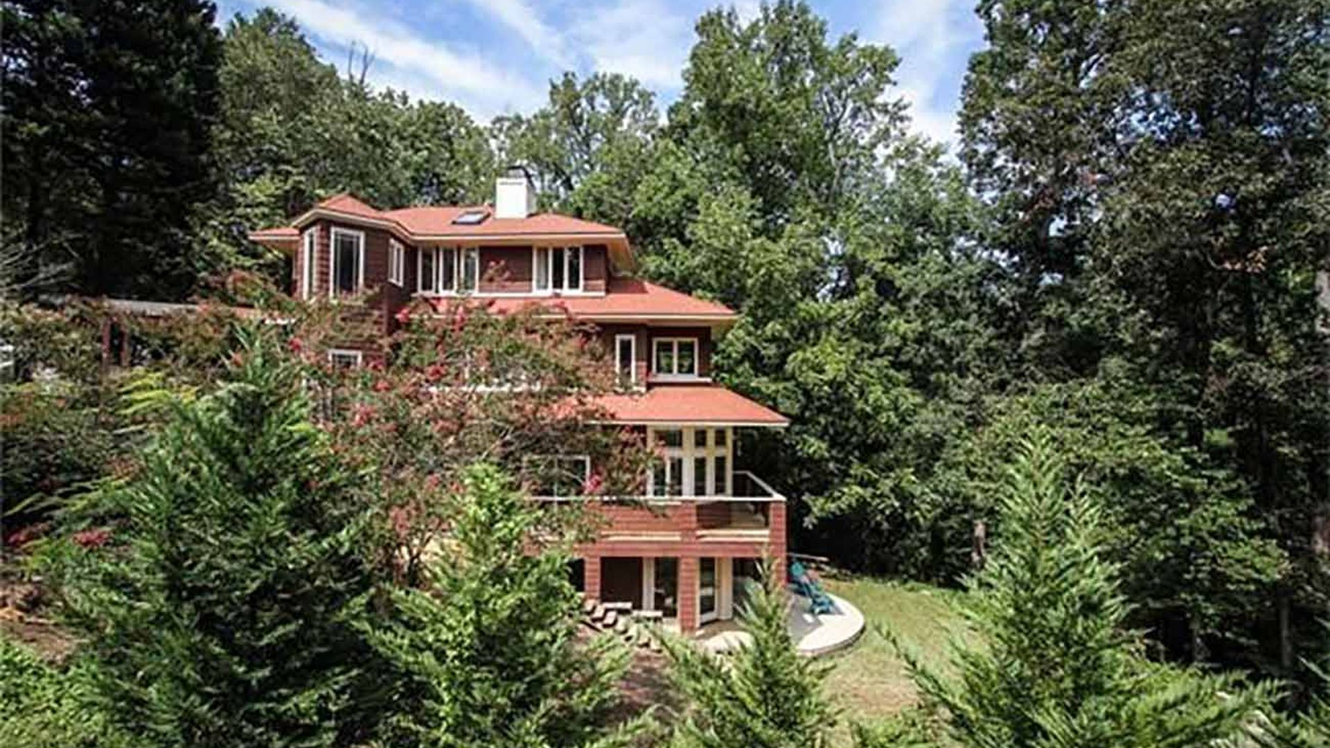 The four bedroom, two and a half bath home features peaceful views of a stream and the wooded lot feels like a mountain retreat.
