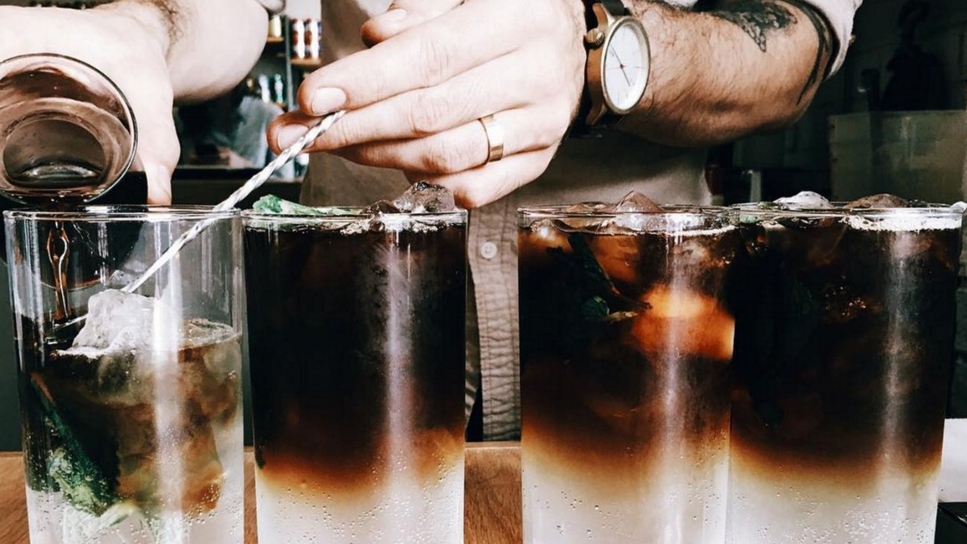 The HEX shandy kind of marries both concepts, replacing beer with cold brew coffee floated over muddled mint, fresh lemon juice, simple syrup and sparkling water.