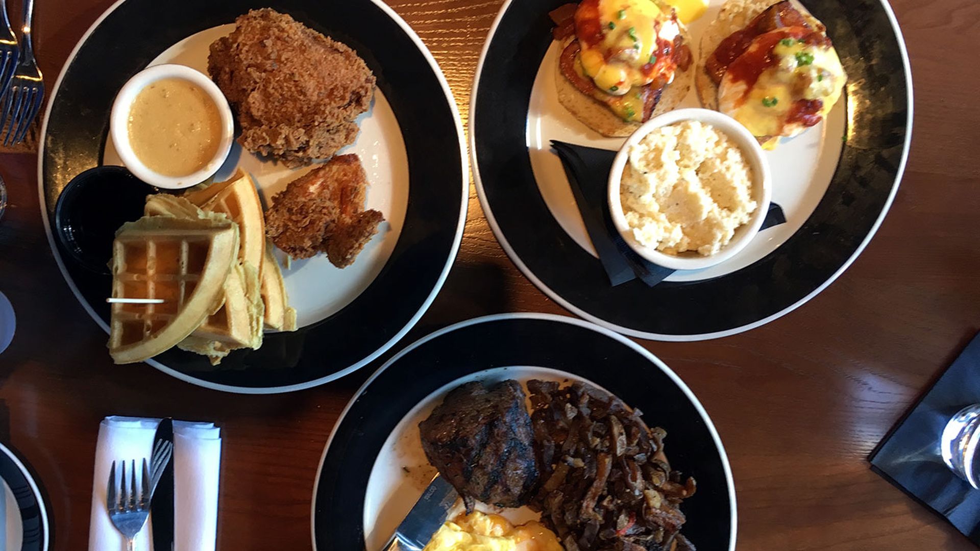 The Chicken & Waffles didn’t have much of a taste to it and was fairly mediocre. Loved the Creole Benedict. Perfect amount of spicy flavor mixed well with the grits, sausage and poached egg. Steak was also cooked perfectly and delicious.