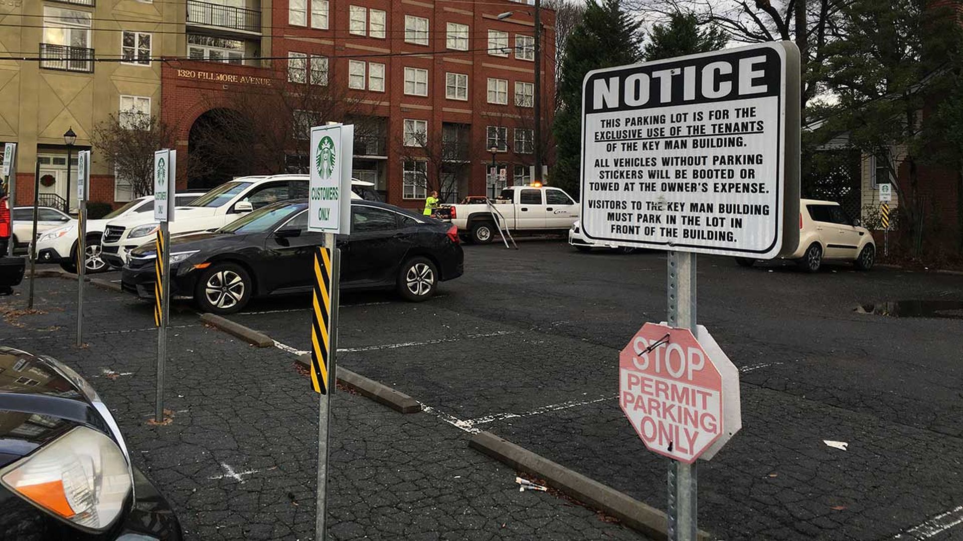 This parking lot has been a flashpoint for years. Only certain parking spots are reserved for Starbucks customers. The rest are for the neighboring Key Man Building. It was this parking lot that led to political pressure on the City Council to change the towing ordinance.