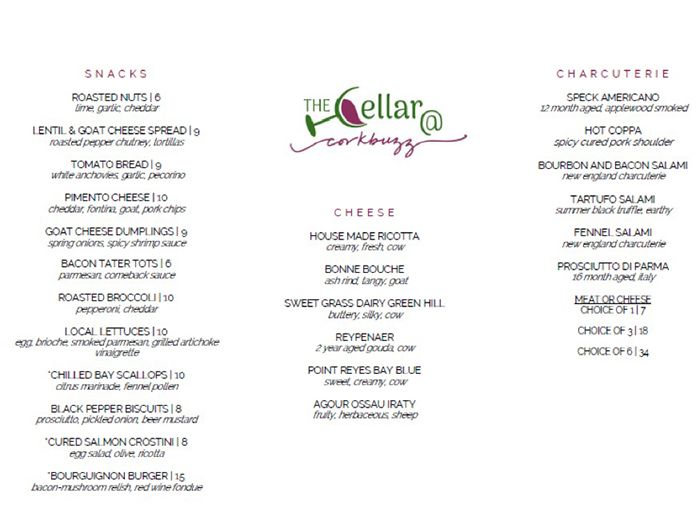 The Cellar @ Corkbuzz will open early next week and its initial hours will be Monday through Friday, 11 a.m. to 10 p.m. and Saturday and Sunday, 11 a.m. to midnight. Charcuterie and cheese plates will be available all day and small plates will begin to be served at 4 p.m.