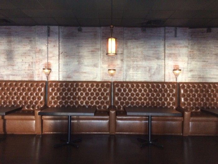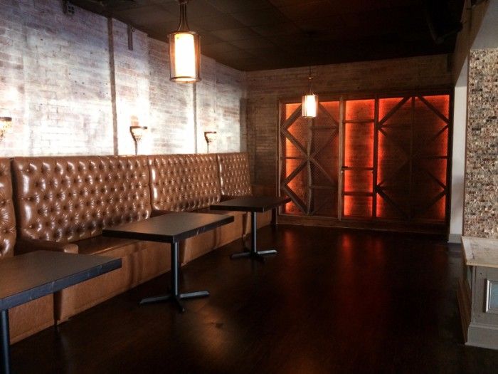 There are about 18 seats at a dominant U-shaped bar to the left, high-back leather booths lining the perimeter and high-top tables in the middle. They’ll also have outdoor seating on the front patio.