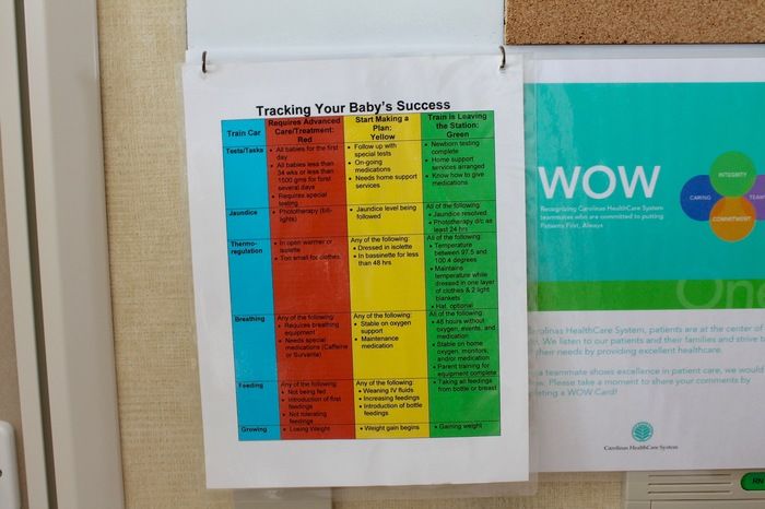 Every room also has a train on the wall. The train helps track the baby’s success and gets updated every day. The cars all start out red but then move to yellow and green as the baby gets healthier. When the train is all green, it’s time for baby to go home.