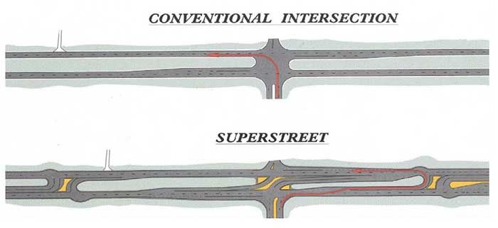 A superstreet, according to the NCDOT, is one with more efficient intersections. Side streets are only permitted to turn right onto the superstreet, instead of being able to go left or straight. If they want to go the other way, they’ll have to proceed to a U-turn point.
