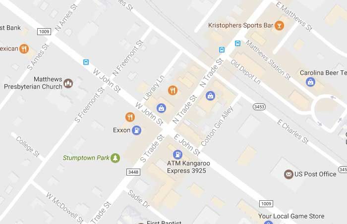 At issue is the segment that runs straight through Matthews’ downtown. The project actually begins right near the central intersection of John and Trade. This is the Matthews version of Trade and Tryon, minus the skyscrapers.