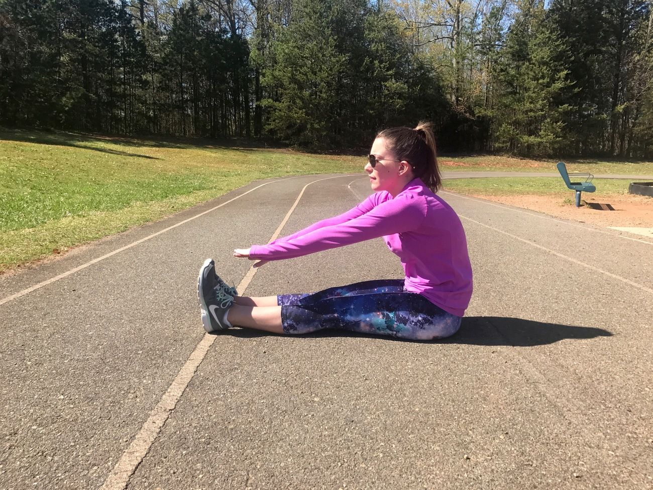 Begin sitting upright with both legs in front of you. Gently leg forward, hinging at your hips until you feel a stretch on the back of your legs.