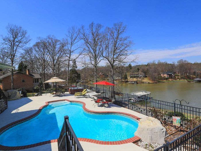 This 5,780-square-foot lakefront home has a salt water pool and hot tub and is available for events up to 80 people. Rental as an event space requires a minimum 7-night stay at $633/night plus an event fee of $1500 – $1800.