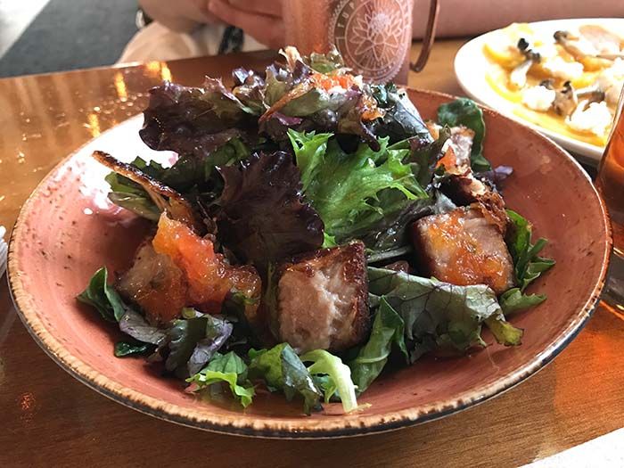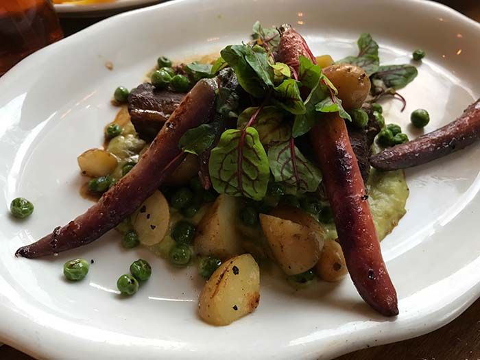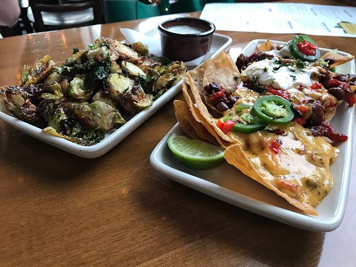 The Brussels (the highlight of the meal) are made with lemon and chopped bacon and served with garlic buttermilk ranch while the nachos are topped with chorizo, black-eyed peas, salsa, sour cream and jalapeños.