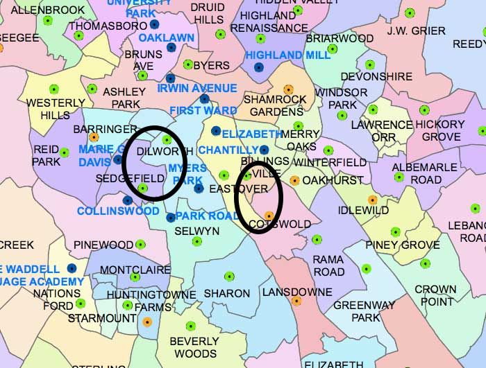 Dilworth Elementary’s zone will be combined with Sedgefield Elementary, lumping the two together into one mega district. Similarly, Cotswold Elementary will be combined with Billingsville Elementary creating its own mega district.