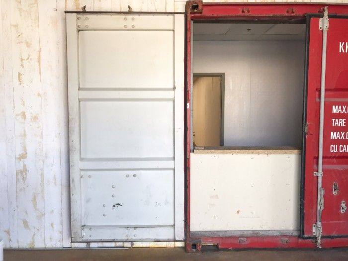 The kitchen is inside a repurposed red shipping container with cut-outs so guests can watch fresh guac and tortilla prep.