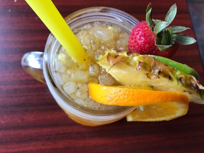 The Mason Jar Tea Refreshers ($5.25) packed with diced fruit, jellies and chia seeds are a showstopper.
